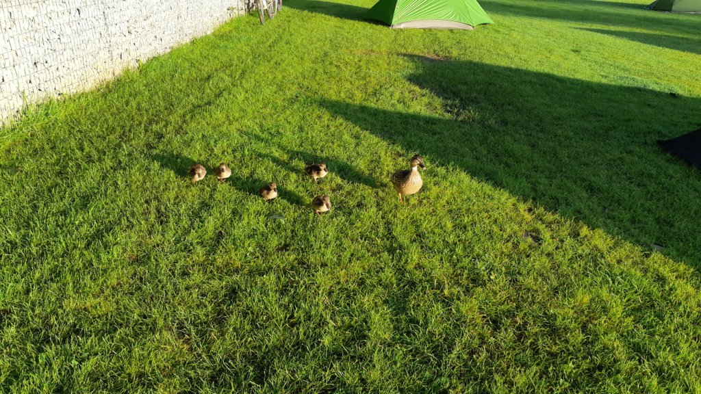Майка патица с бебетата, идват да инспектират палатките