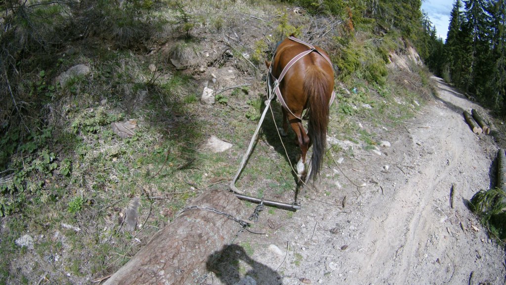 Кобила изтегля дървета от гората