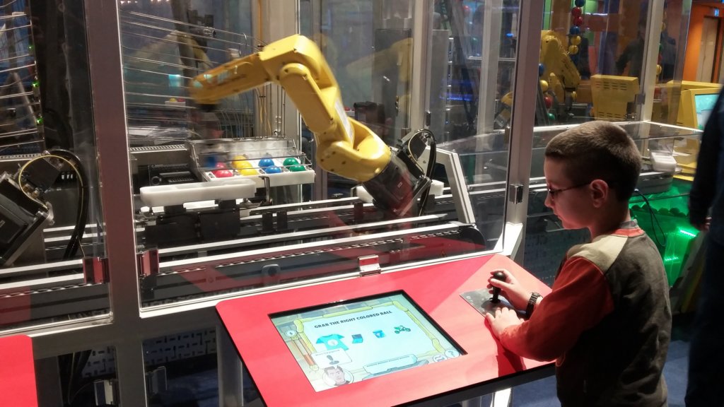 Боби управлява роботизирана ръка, като подрежда топките по цветове, подобно на склад със стоки