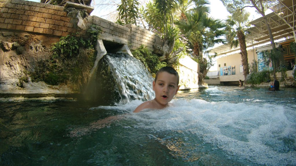 Боби при водопада който пълни басейна